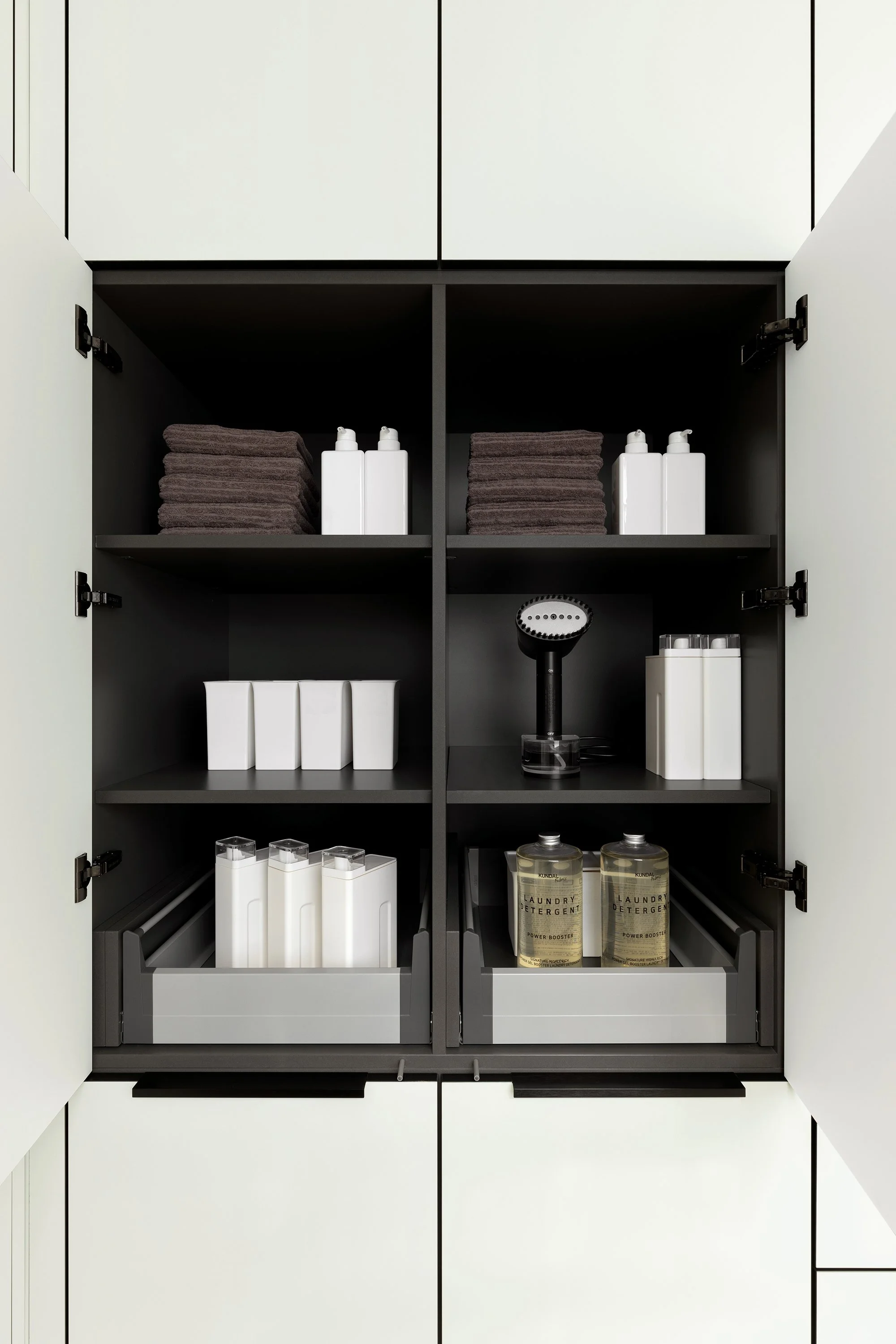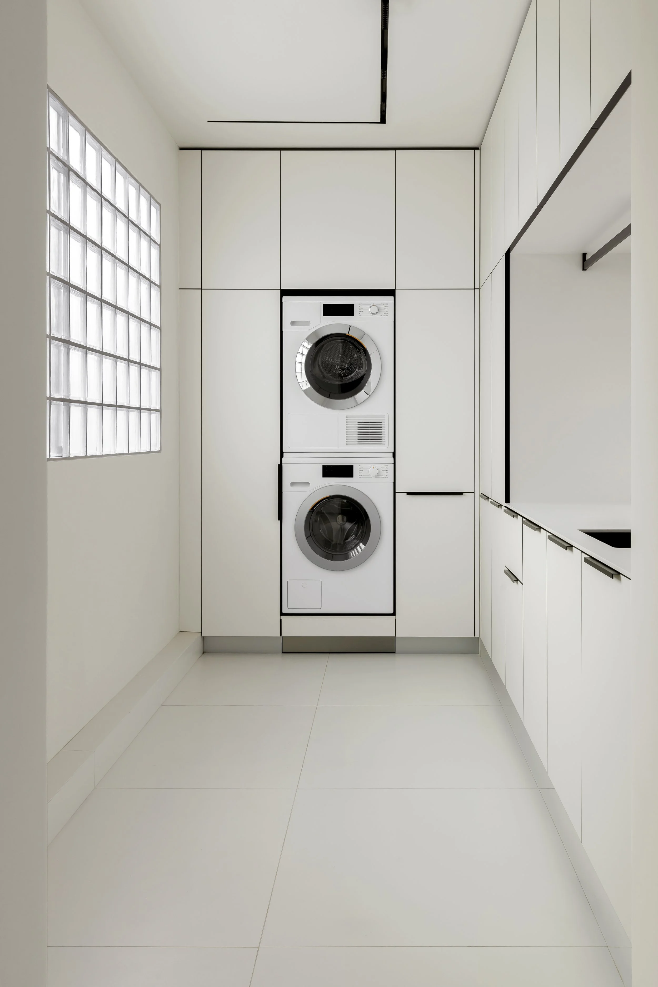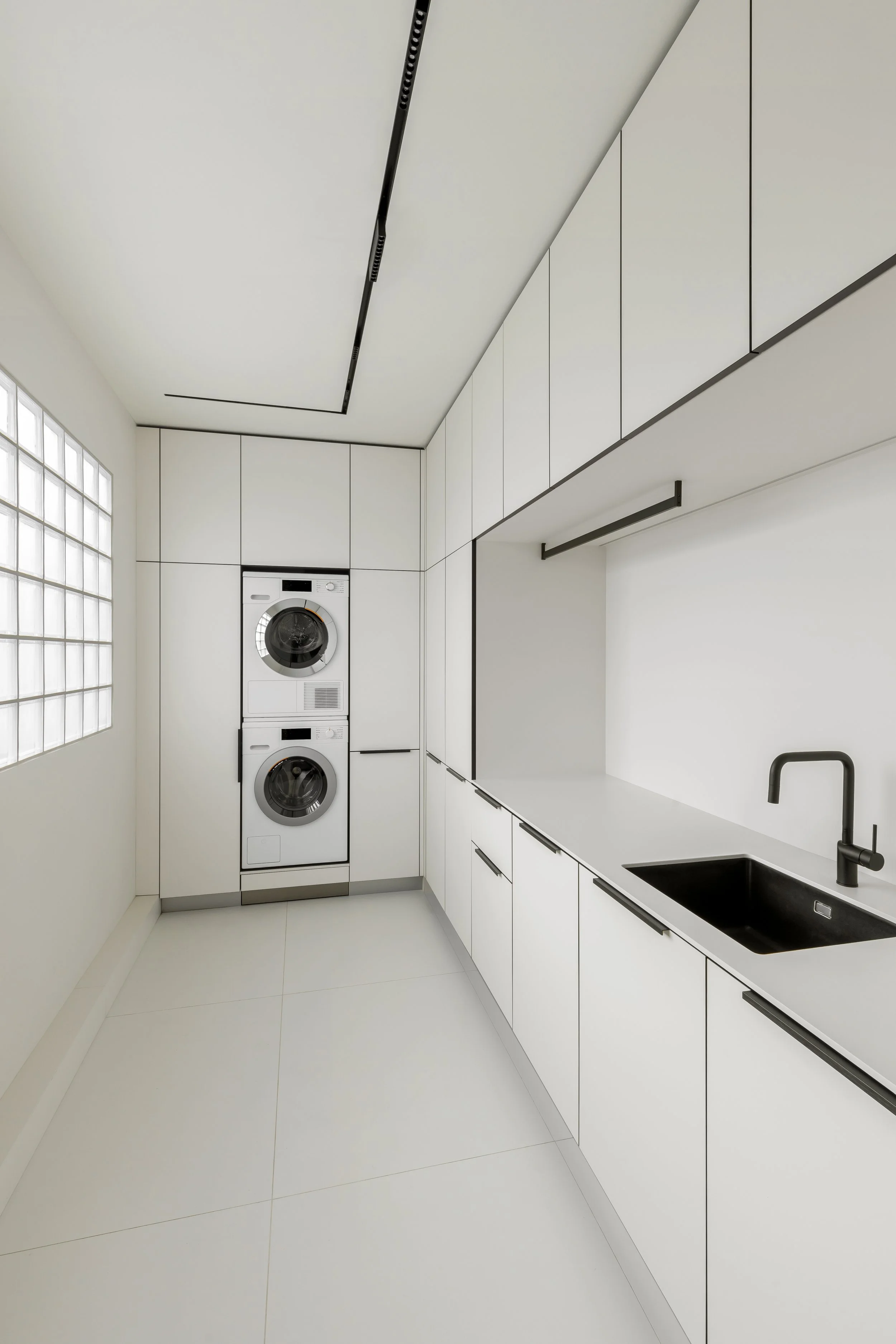 블랙&화이트 컨셉의 보조주방&런드리룸은 산뜻한 컬러감과 세심하게 각이 맞춰진 엣지로